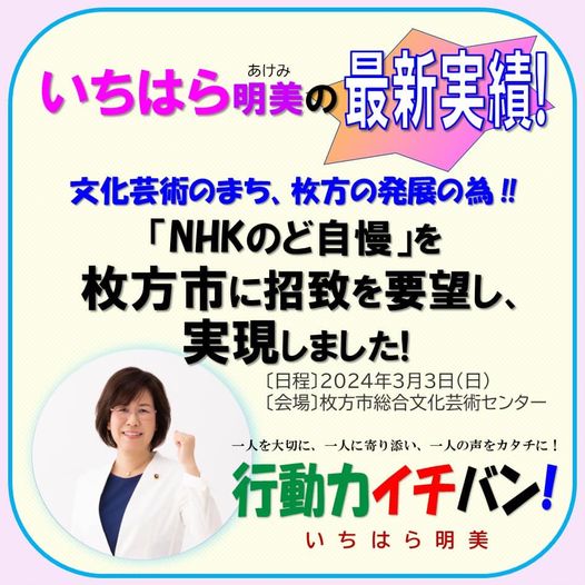 #枚方市総合文化芸術センター での「NHKのど自慢」の積極的招致で市のPRを‼︎と令和3年12月議会にて要望しており、この度実現致しました😊