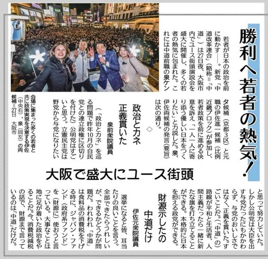 27日の夜に、「中道」は大阪市難波でユース街頭演説会を開催!なんと約2,000人の聴衆であふれかえり、さながらフェス状態に!「中道」は奨学金返済減税や、NISA減税、家賃補助制度など、ワカモノに優しい政策を実現します!