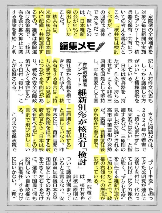 維新は「核共有は検討すべき」がなんと91%(毎日新聞が衆院選の全候補者にアンケートした結果)核共有は、米軍の核兵器を日本国内に配備・共同運用するもの→国是である「非核三原則」のうちのひとつ「核を持ち込ませず」に抵触する高市首相は非核三原則を堅持するとは、いまだに明言しない。こんな政権、危ない。
