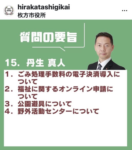 2025年12月15日一般質問に登壇しました12/15(月)一般質問に登壇しました。なぜ、コンビニで売ってる枚方市のゴミ処理券は現金でしか買えないのか?公園に健康遊具を設置して!岐路に立つ、枚方市野外活動センターの今後は?など、約30分の質問で…