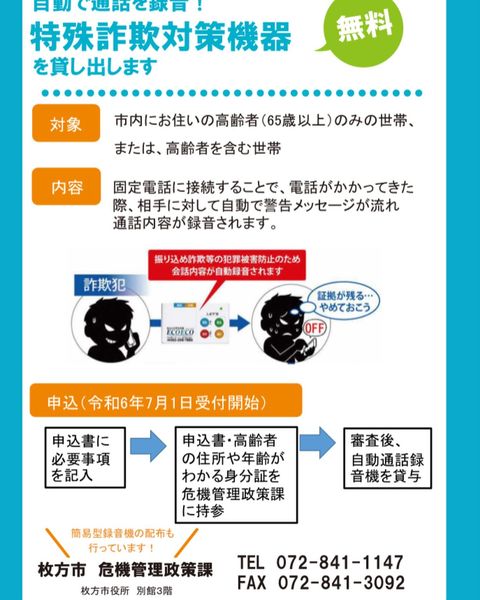 2024年6月20日特殊詐欺対策機器の貸与特殊詐欺対策!私が令和5年12月議会の一般質問で提案し、実現した「特殊詐欺対策機器の貸与」。固定電話に接続することで、電話がかかってきた際、相手に対して自動で警告メッセージが流れ、通話内容が録音されま…